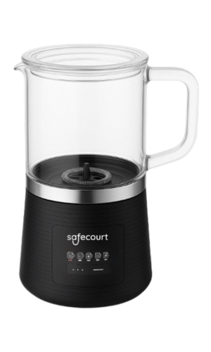 Safecourt Glazen melkopschuimer een unieke, volledig PFAS- en Teflonvrije melkopschuimer met uitneembare glazen kan voor barista-kwaliteit thuis. Met één druk op de knop kies je uit 5 functies (dik schuim, dun schuim, koud schuim, verwarmen, chocolademelk) en krijg je altijd een volle, stabiele schuimlaag ook met plantaardige melk zoals haver, soja of amandel. De glazen binnenzijde bakt niet aan, schenkt netjes uit en is vaatwasserbestendig, zodat schoonmaken letterlijk een handomdraai is. De glazen melkopschuimer werkt stil en is snel klaar (perfect voor 2–3 cappuccino’s per sessie). Compact, stijlvol en gebouwd voor dagelijks gebruik met 2 jaar garantie en een klantenservice die voor je klaarstaat.